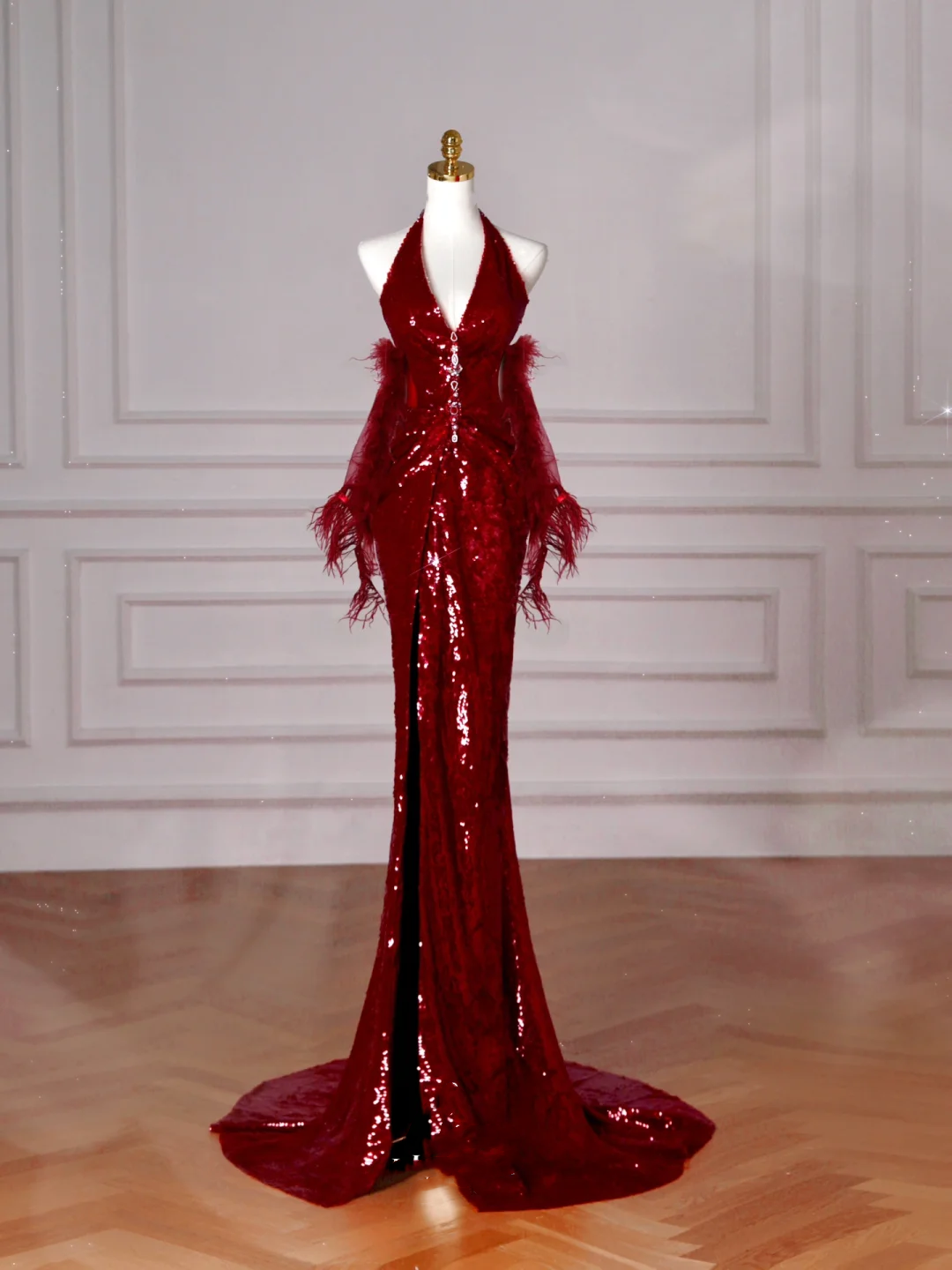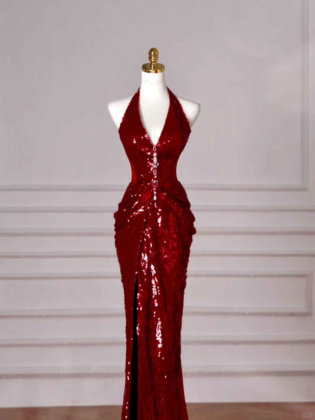 Sexy Burgundy Sequins Halter V Neck Evening Dress Backless Mermaid Evening Dress Y8628