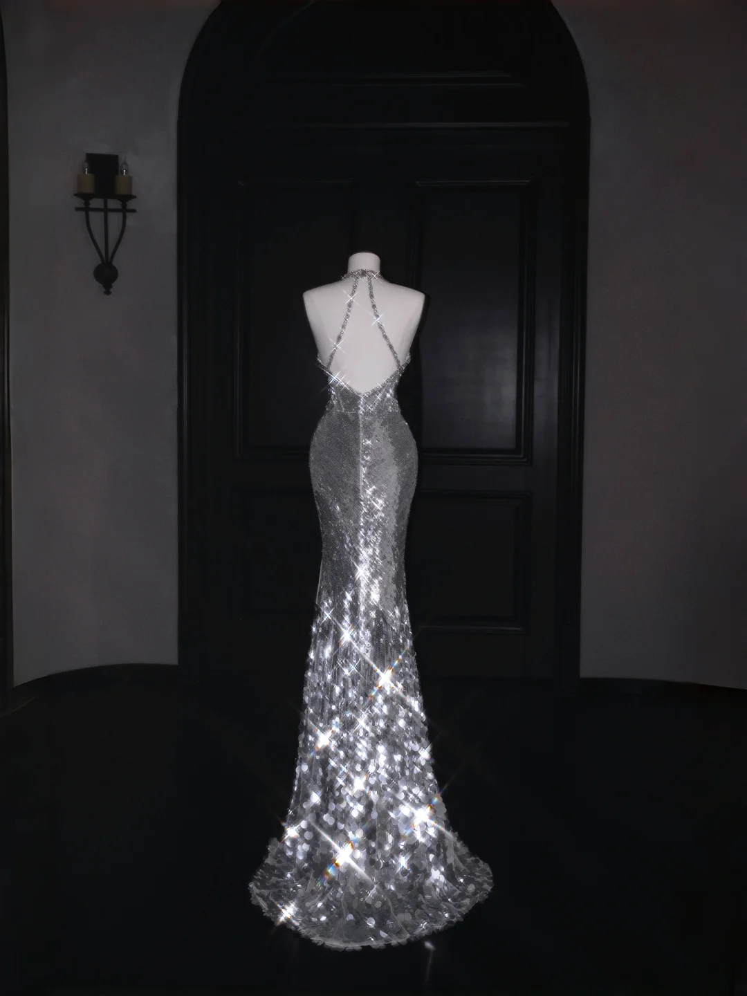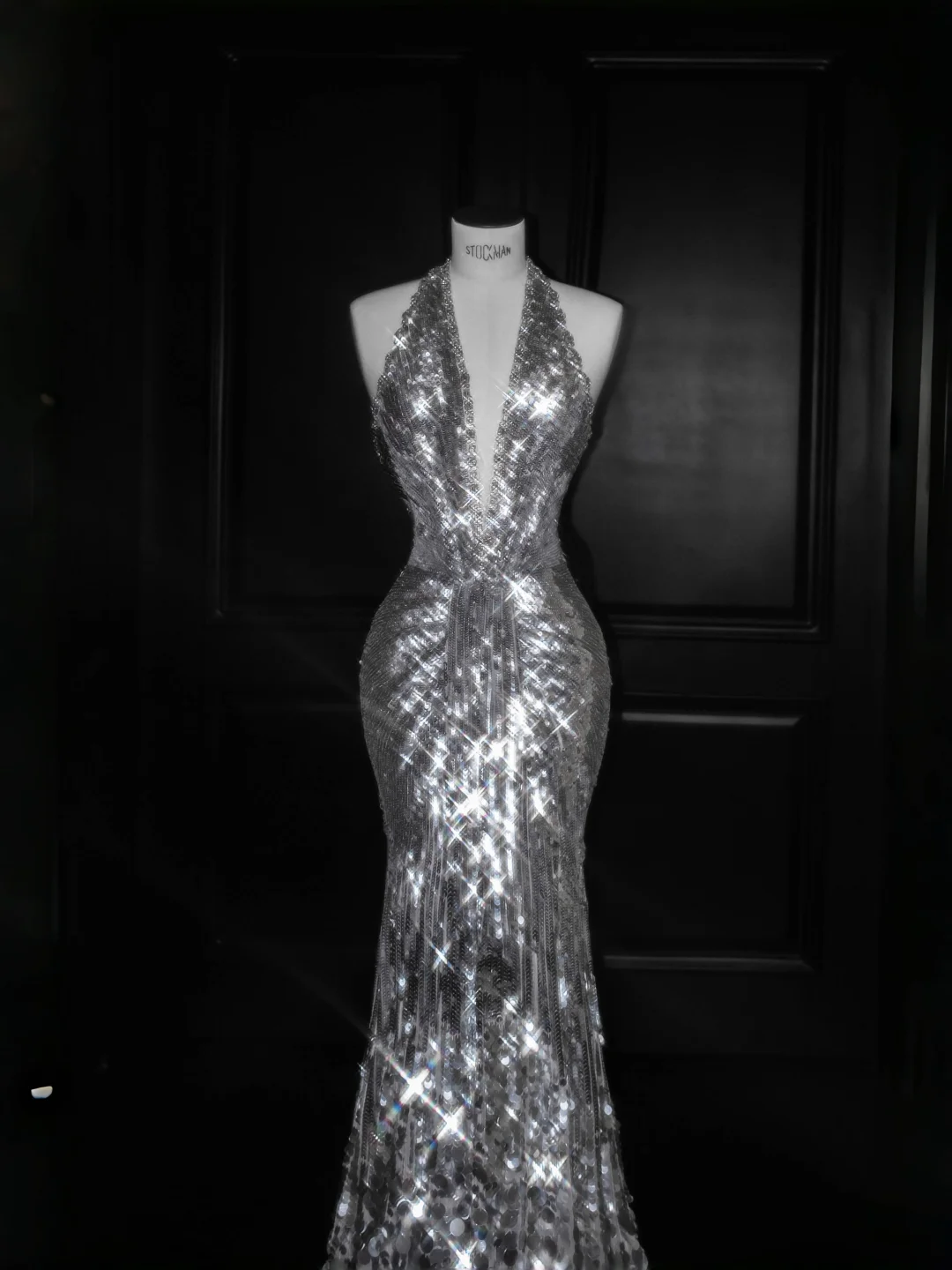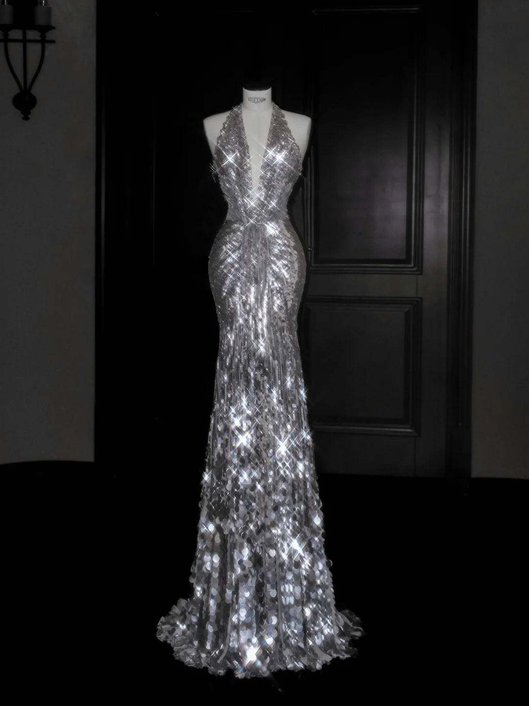 Sparkly Silver Deep V Halter Sequins Beaded Backless Evening Dress Mermaid Prom Dress Y8687