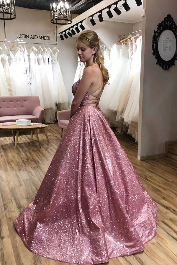Sparkle A-line Scoop Spaghetti Straps Sweep Train Prom Dress with Pockets