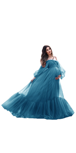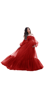 Features | Off Shoulder Maternity Dress | Puffy Sleeve Maternity Tulle Robe | Ruffle Pregnancy Dress | Maternity Gown for Photoshoot | Red Maternity Dress for Shoot | Teal Baby Shower Gown |
