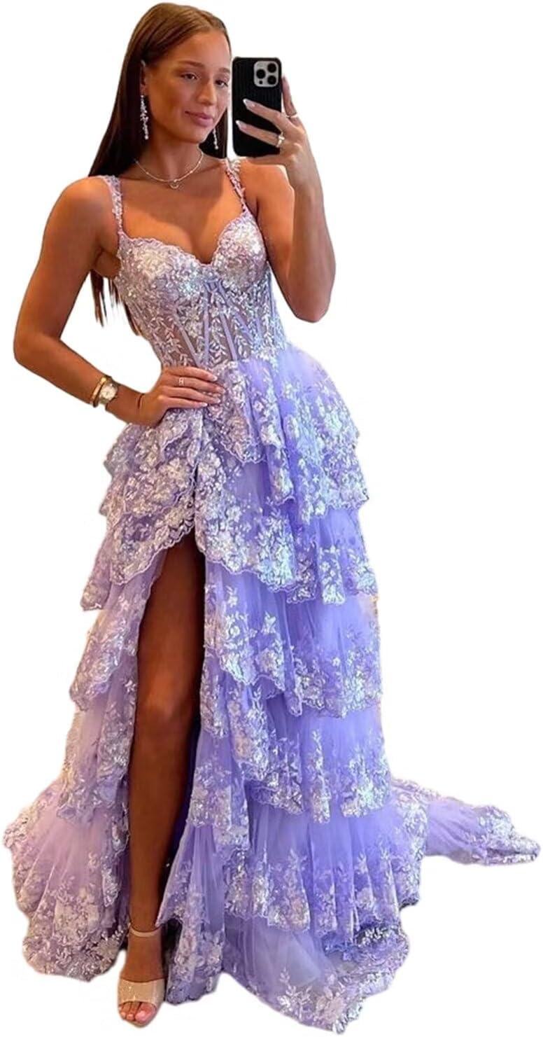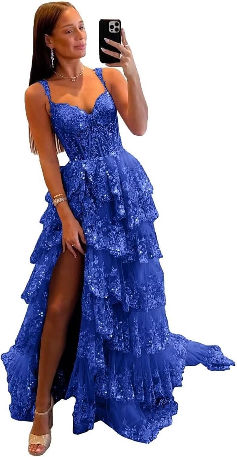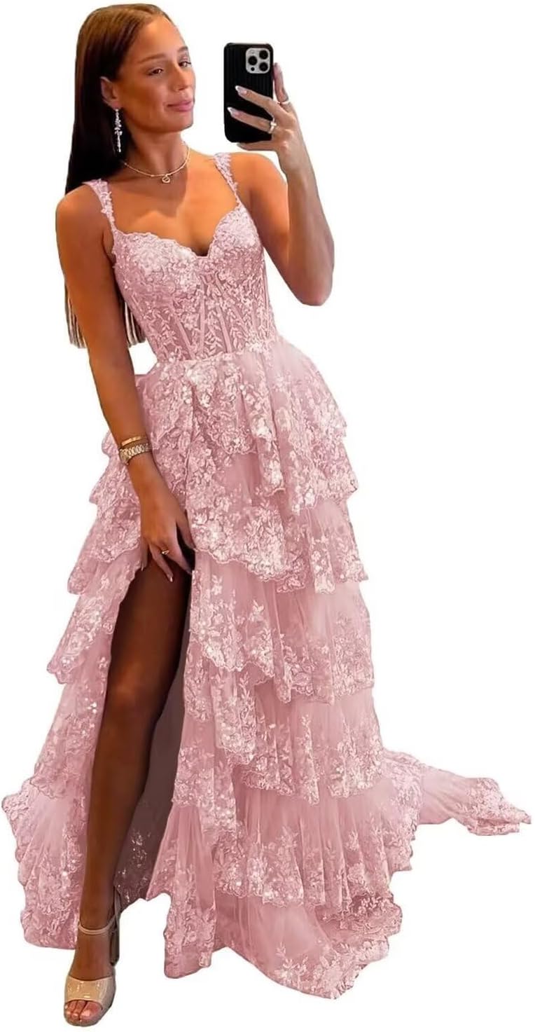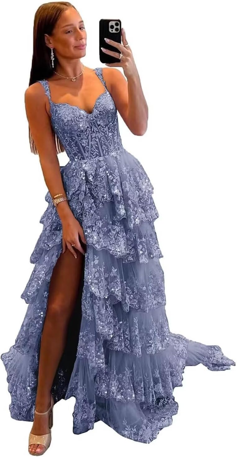 Sparkly Tiered Lace Tulle Prom Dresses Long 2025 Spaghetti Straps Formal Corset Evening Gown with Slit