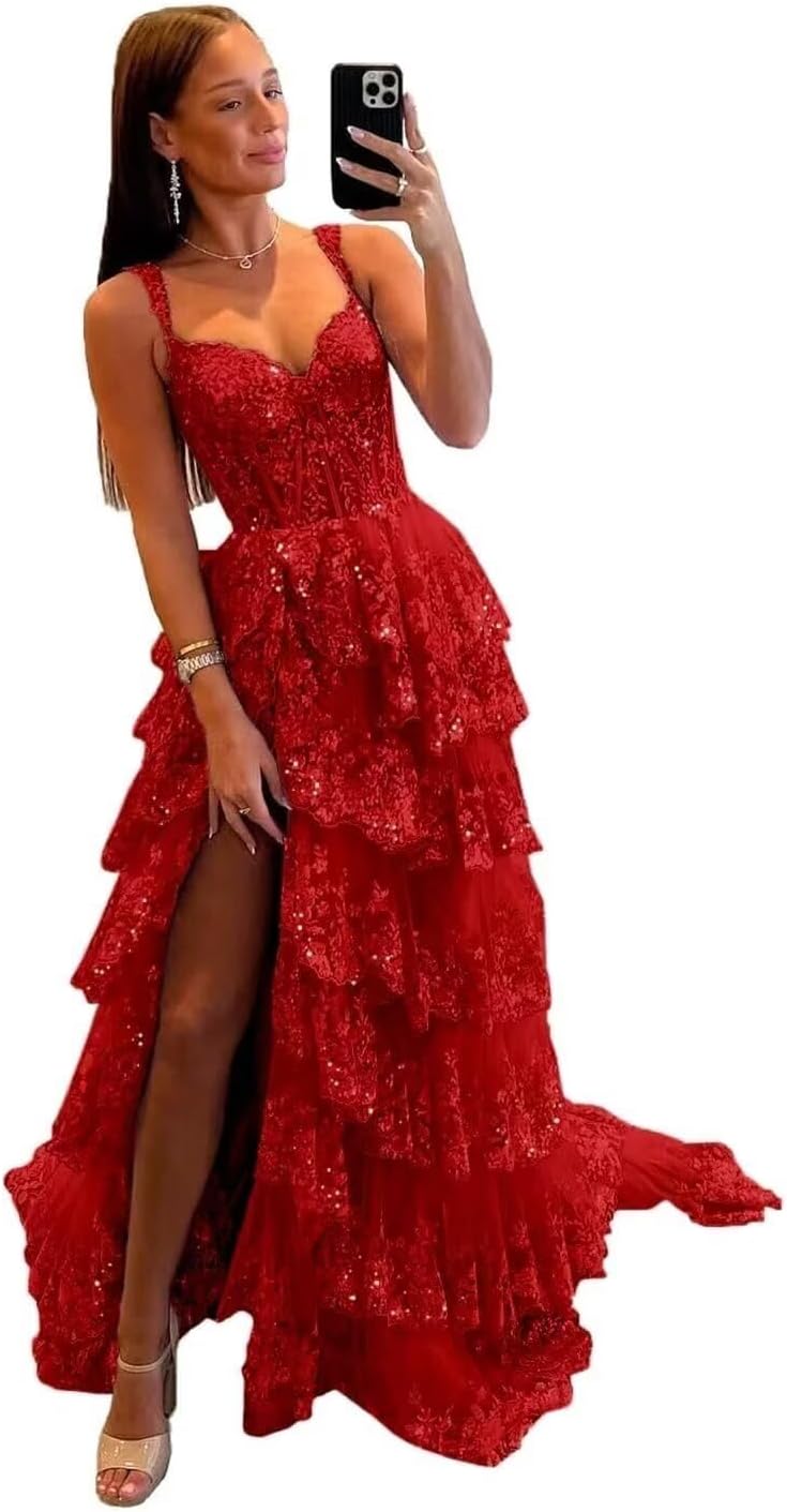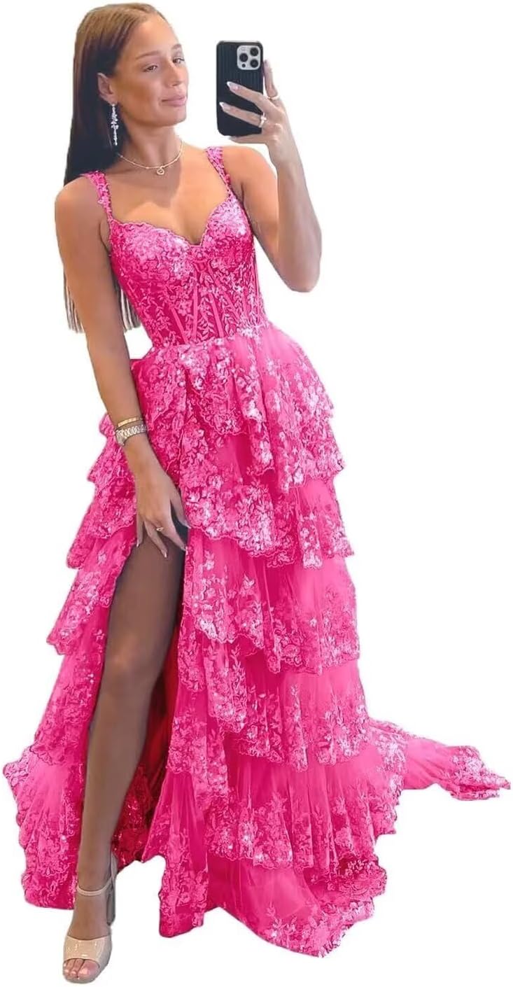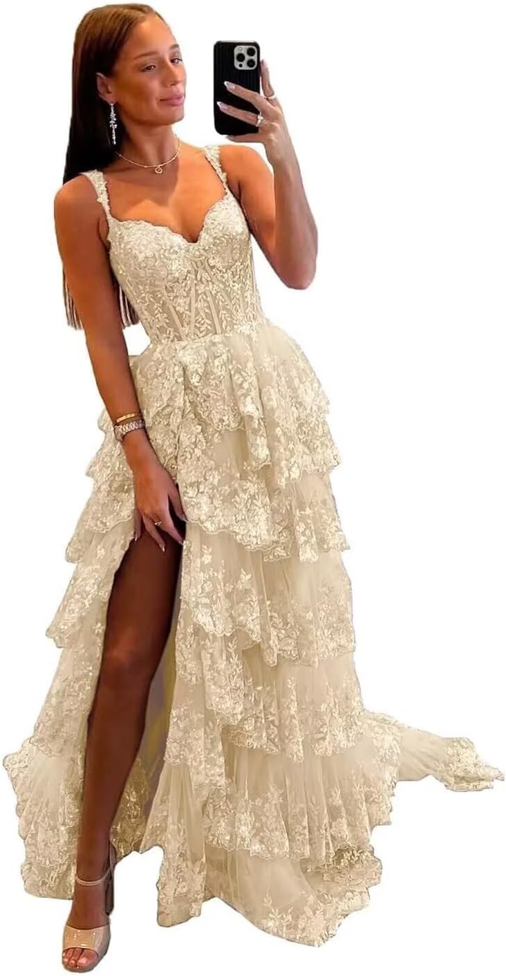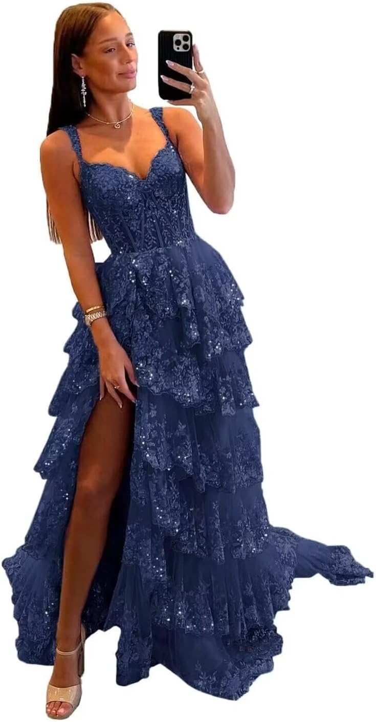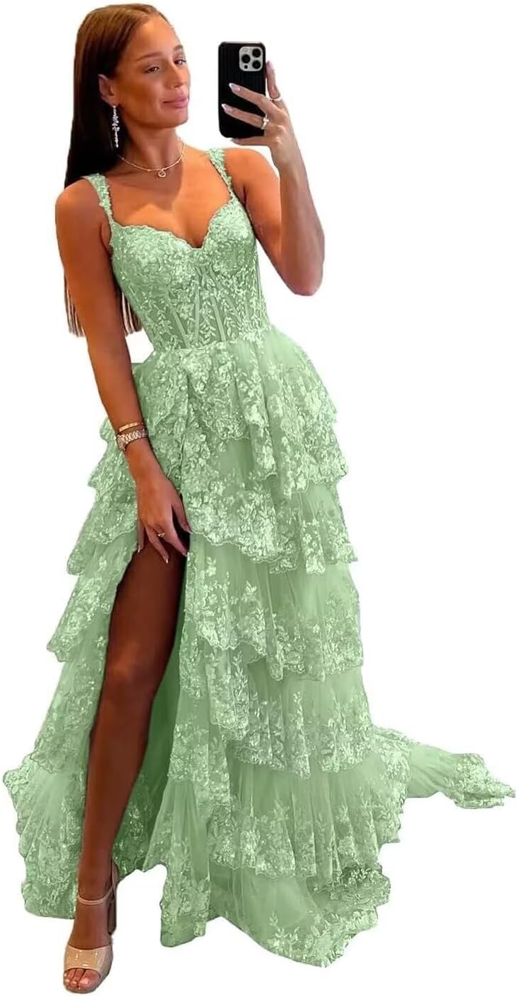 Sparkly Tiered Lace Tulle Prom Dresses Long 2025 Spaghetti Straps Formal Corset Evening Gown with Slit