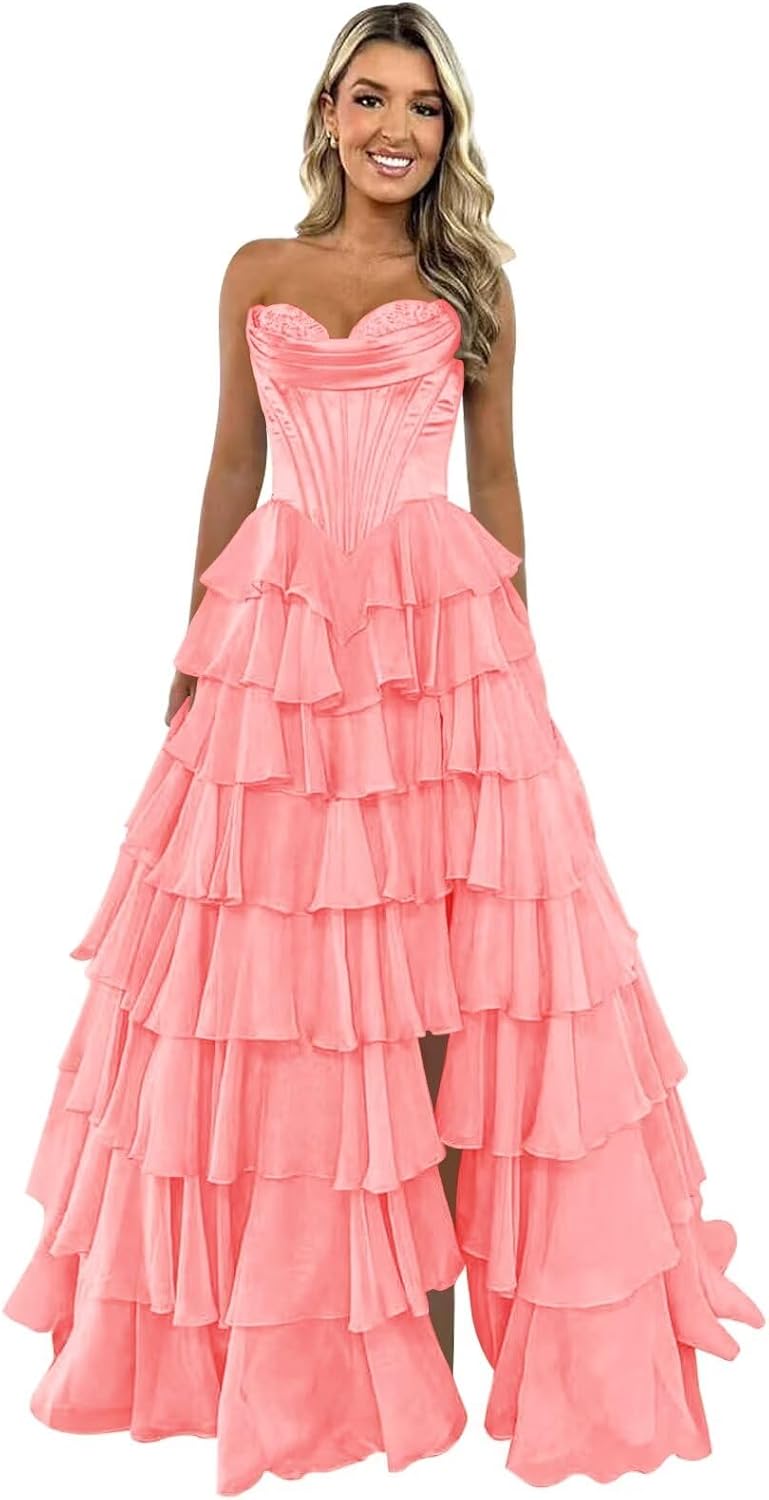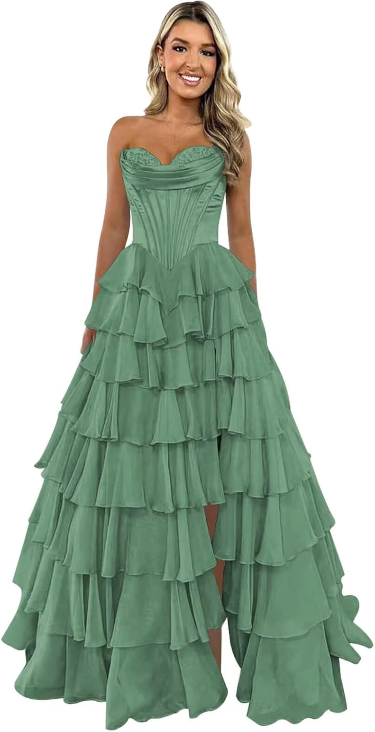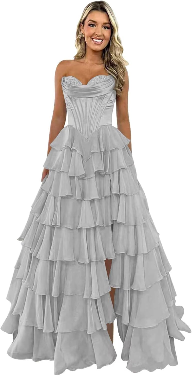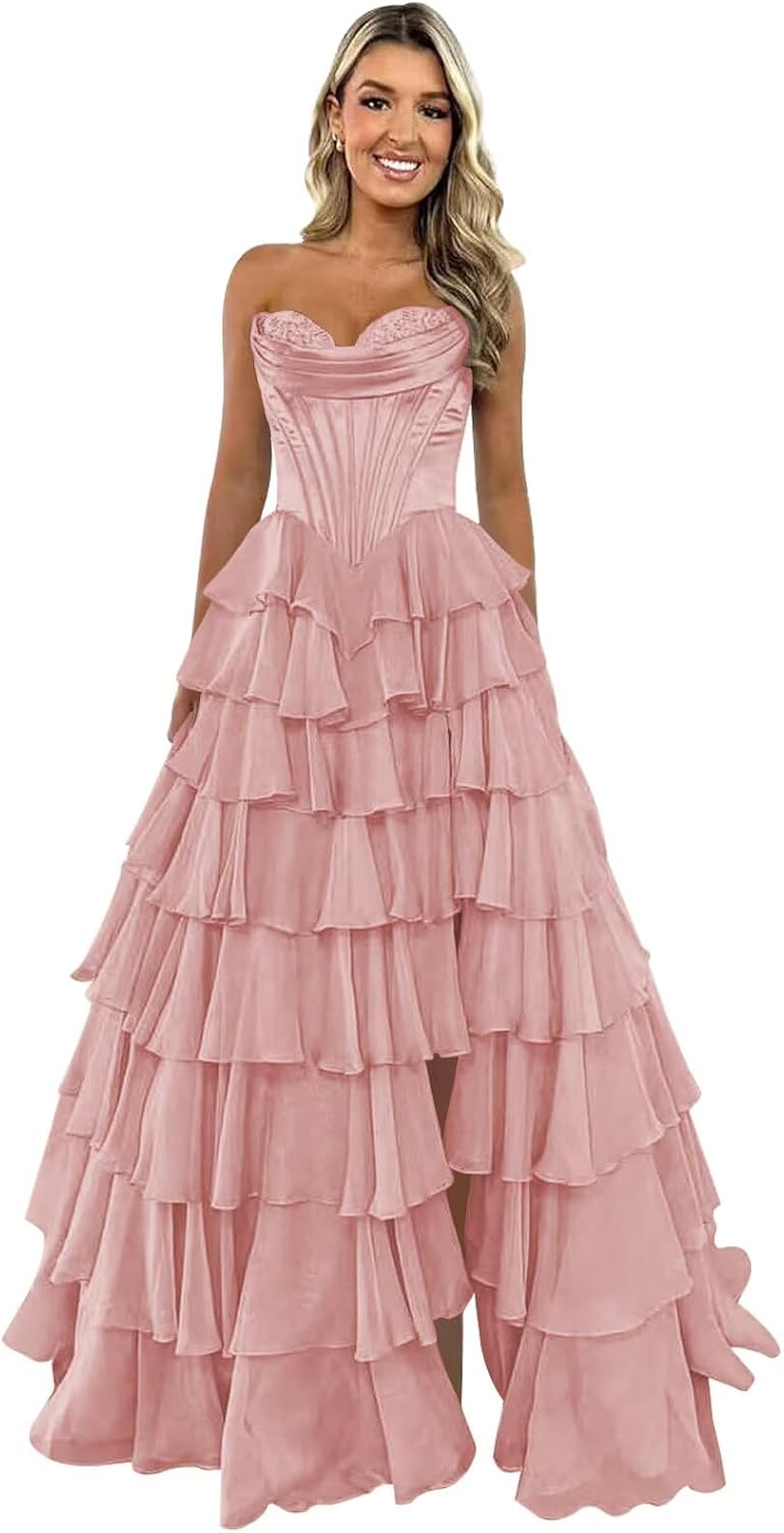 Strapless Corset Prom Dresses for Women 2025 Long Tiered Ruffle Chiffon Formal Evening Gown with Slit