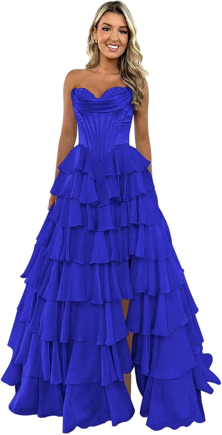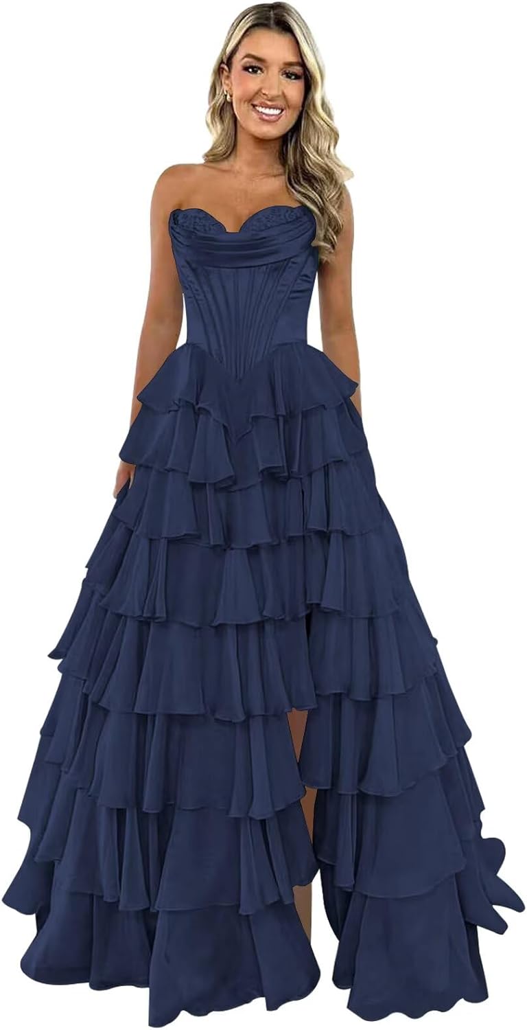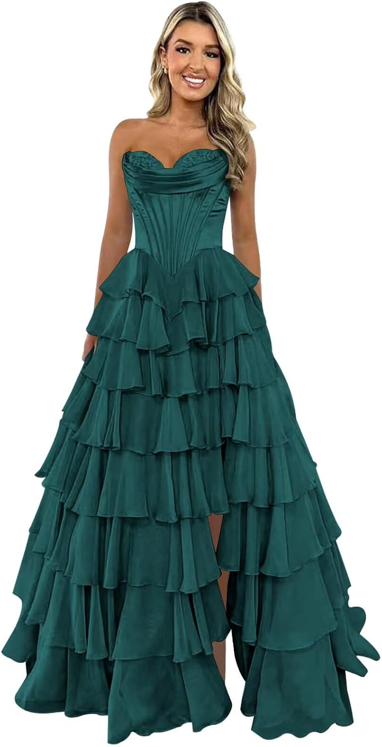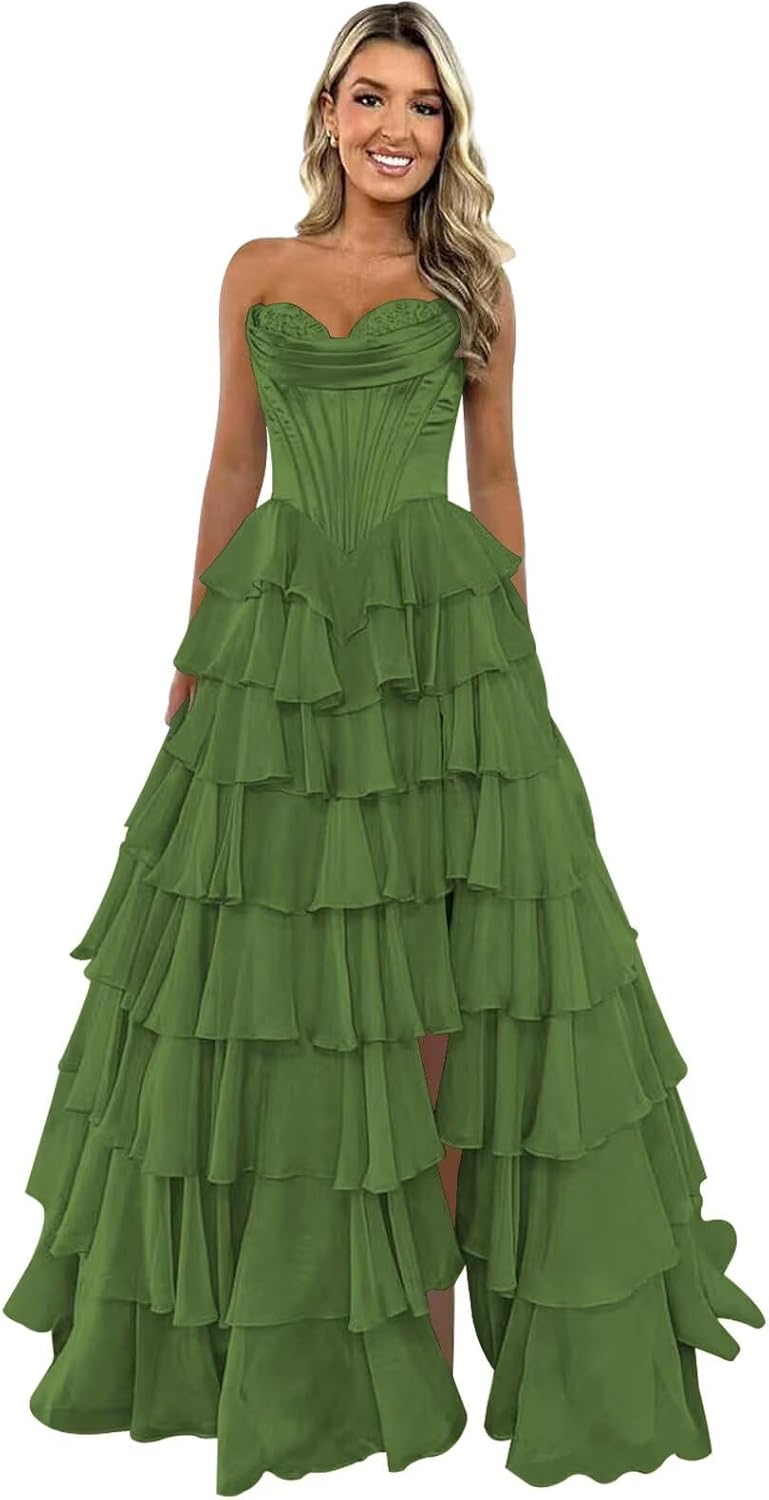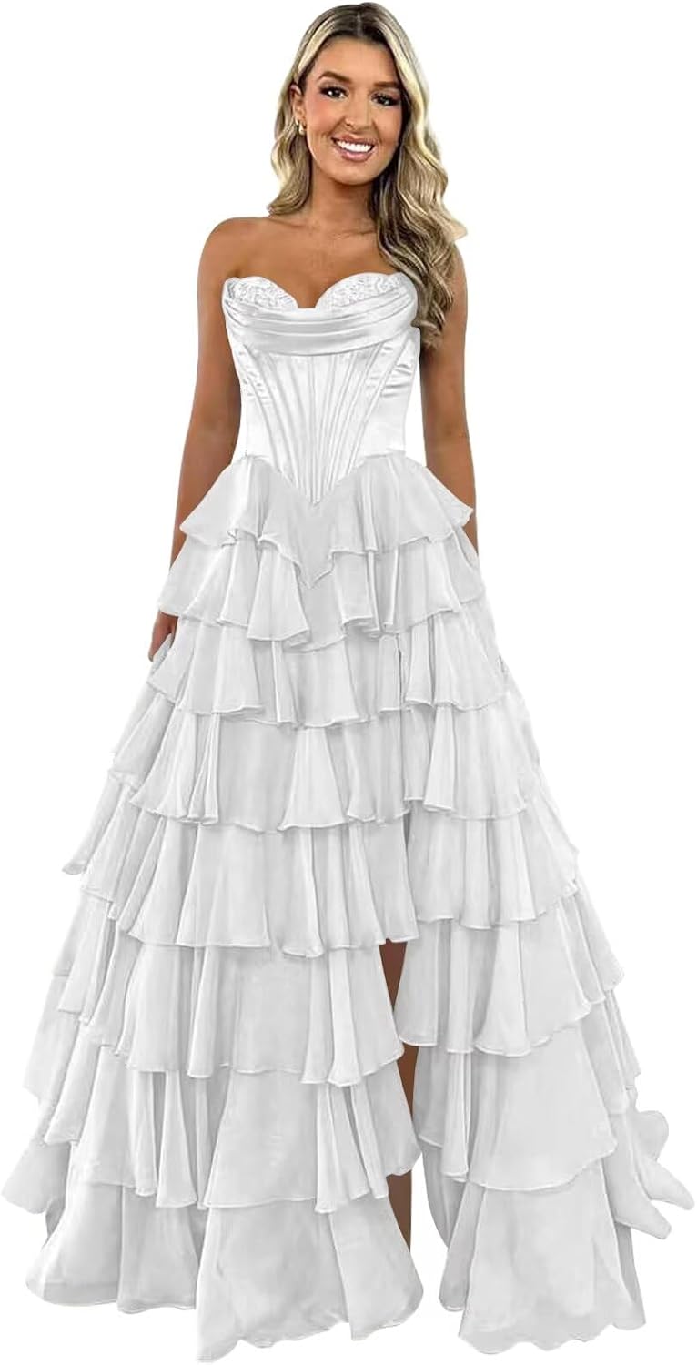 Strapless Corset Prom Dresses for Women 2025 Long Tiered Ruffle Chiffon Formal Evening Gown with Slit