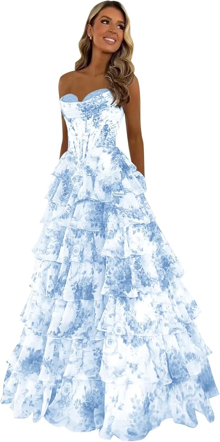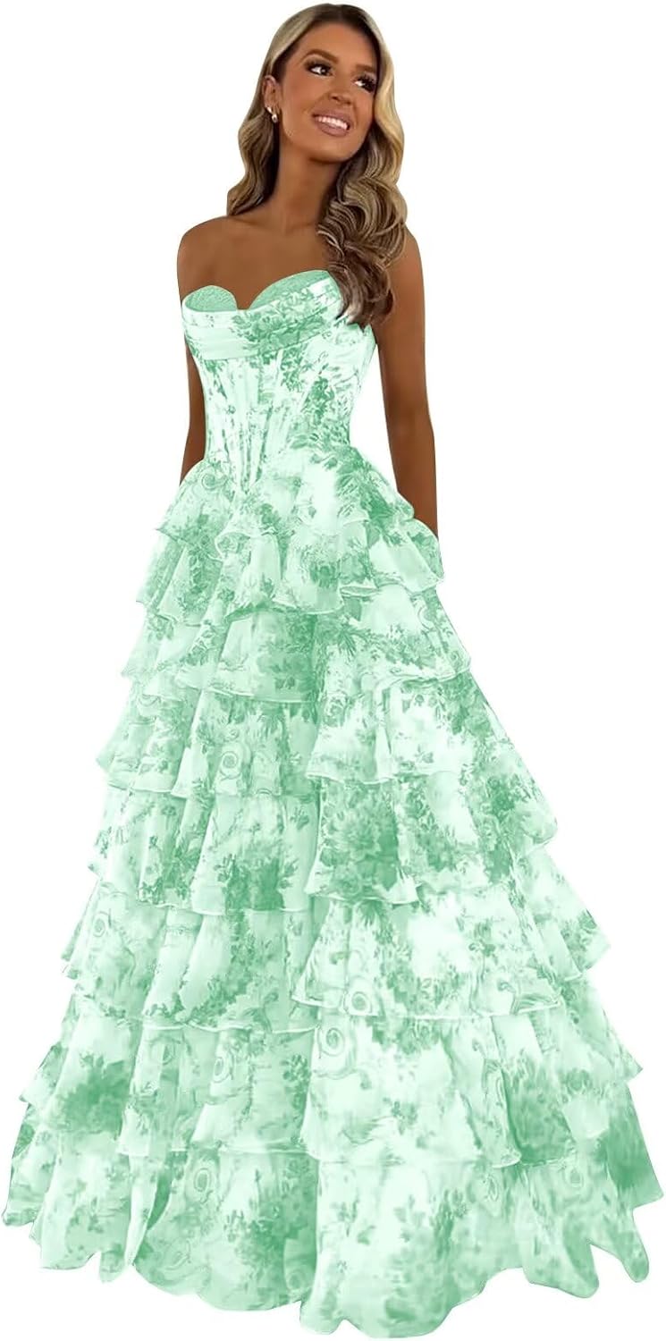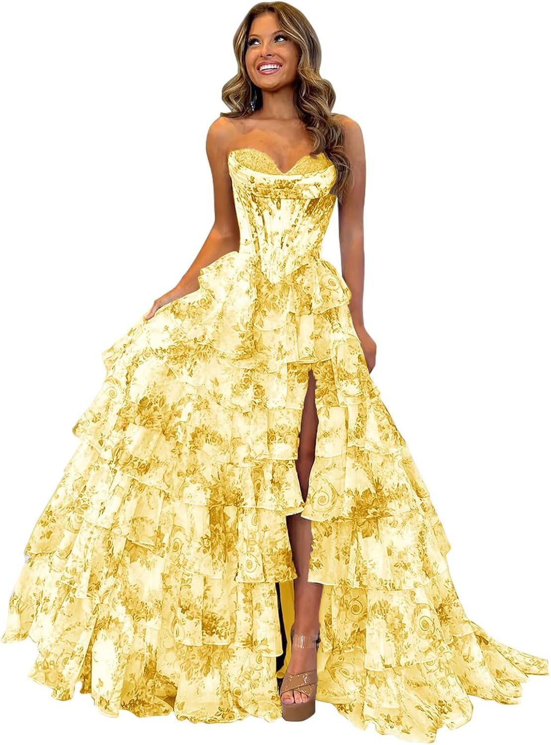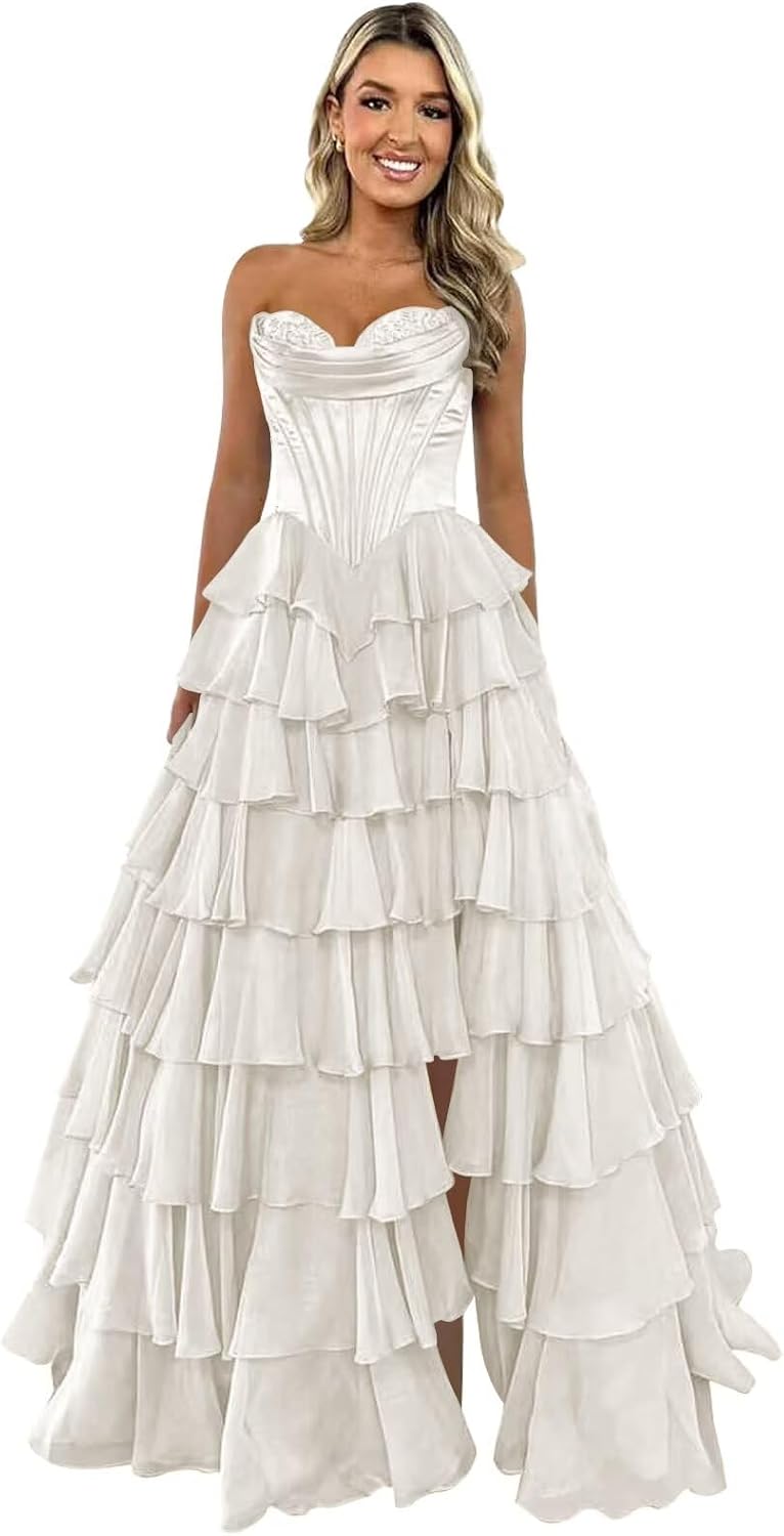 Strapless Corset Prom Dresses for Women 2025 Long Tiered Ruffle Chiffon Formal Evening Gown with Slit