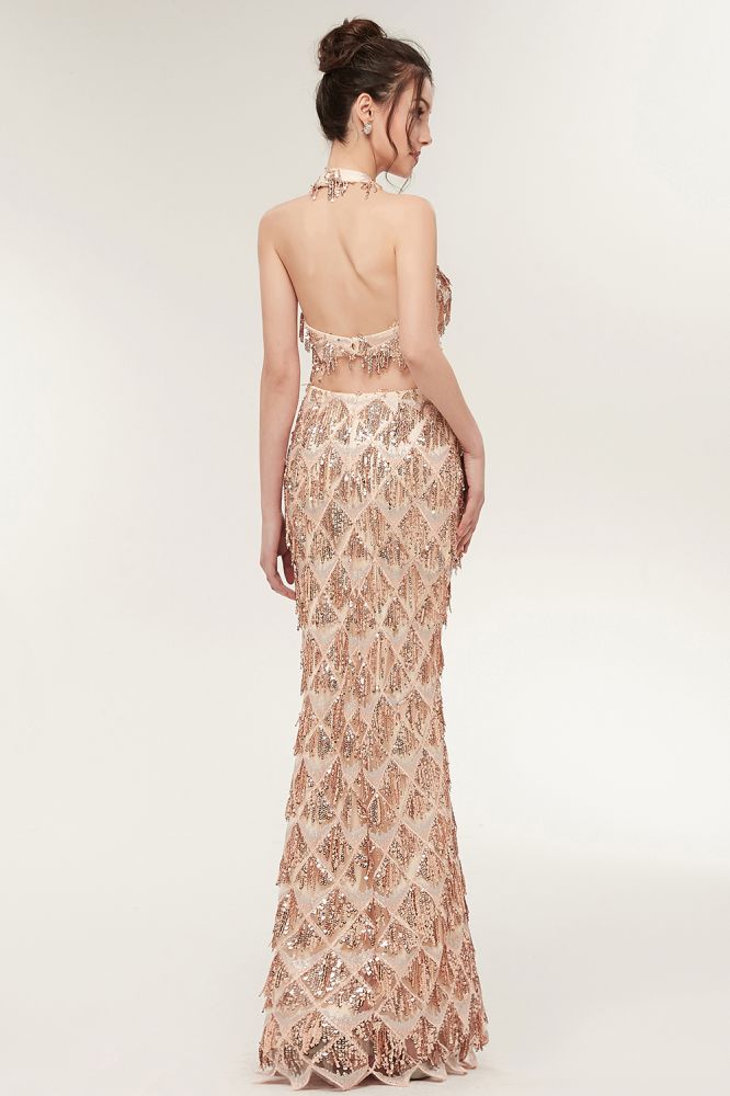 Two-piece Halter Mermaid Long Sequined Patterns Champagne Prom Dresses