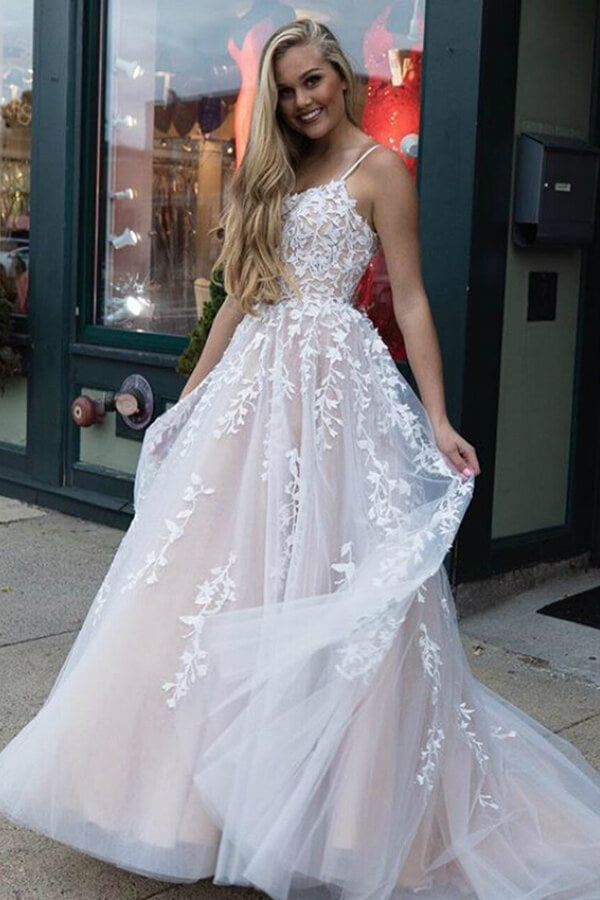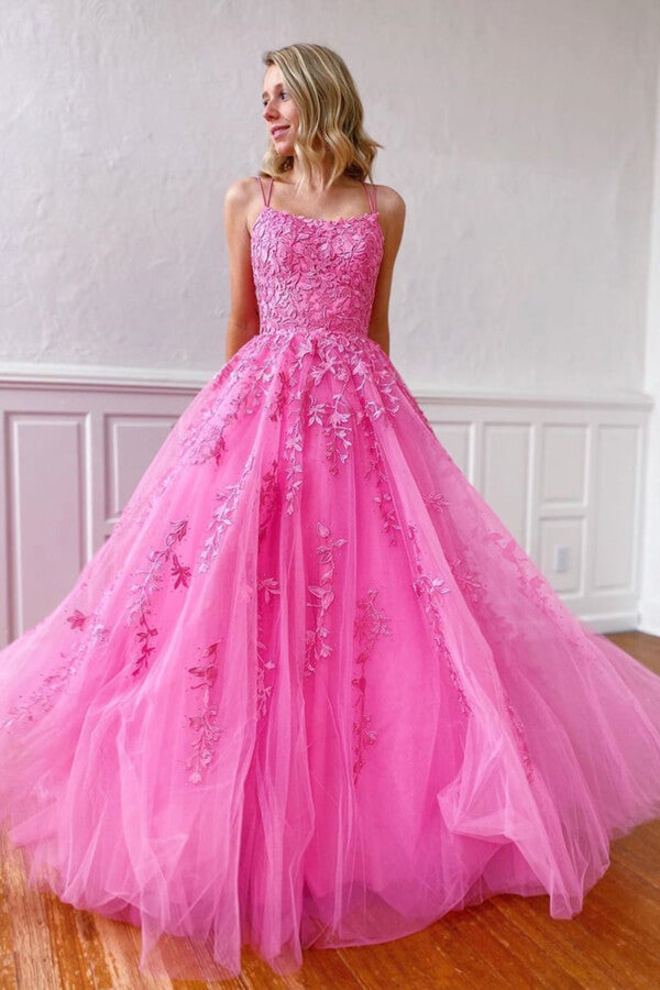 Yellow Tulle Spaghetti Straps Scoop A-Line Prom Dresses with Appliques.?