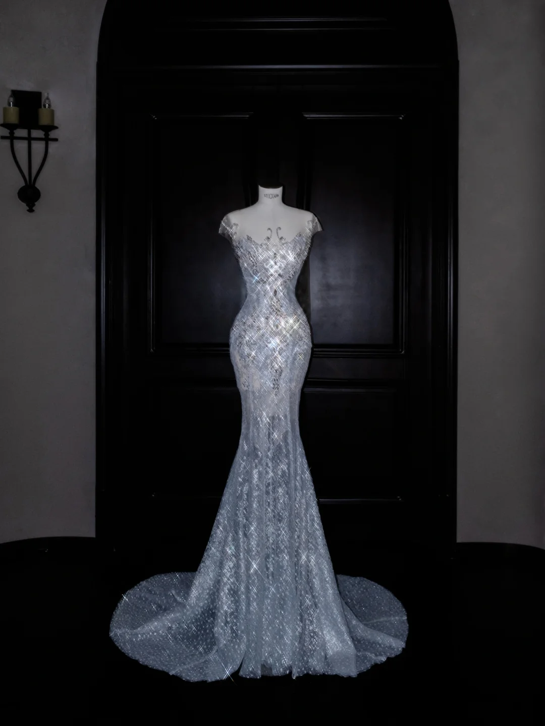Beautiful Mermaid Sequin Beaded Evening Dress Blue Tulle Prom Dress Y8690