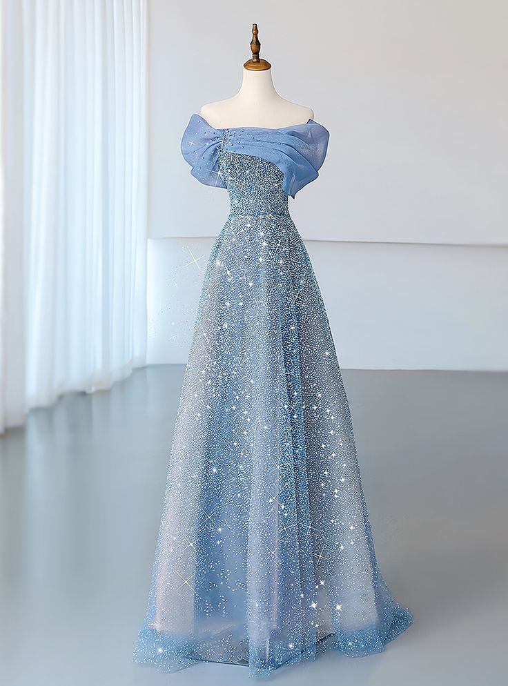 Blue Tulle Sequins Evening Dress Off The Shoulder Pleats A Line Prom Dress Y8041
