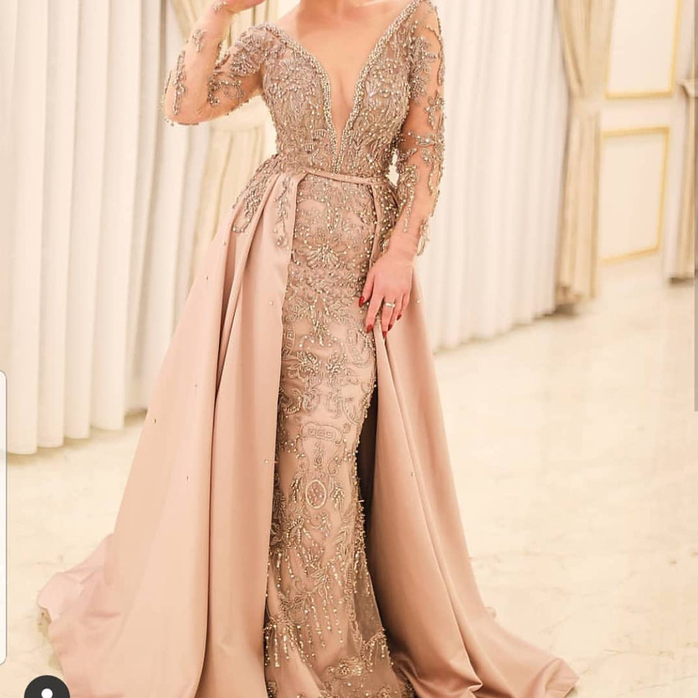 Champagne prom dresses long sleeve beading sequins detachable train crystal beading evening dresses S23375