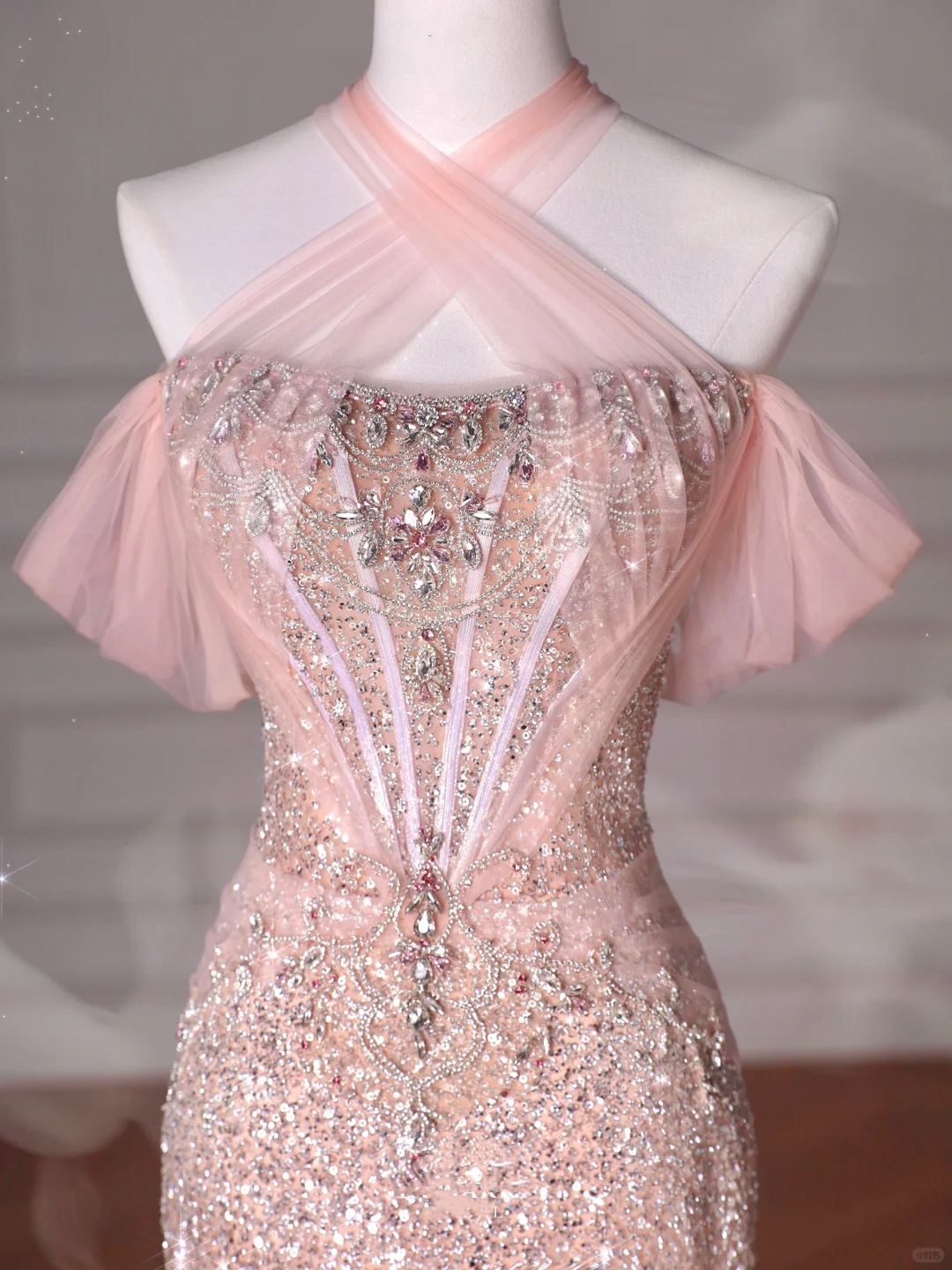 Classy Pink Halter Sequin Beaded Tulle Mermaid Evening Dress Long Prom Dress Y8620