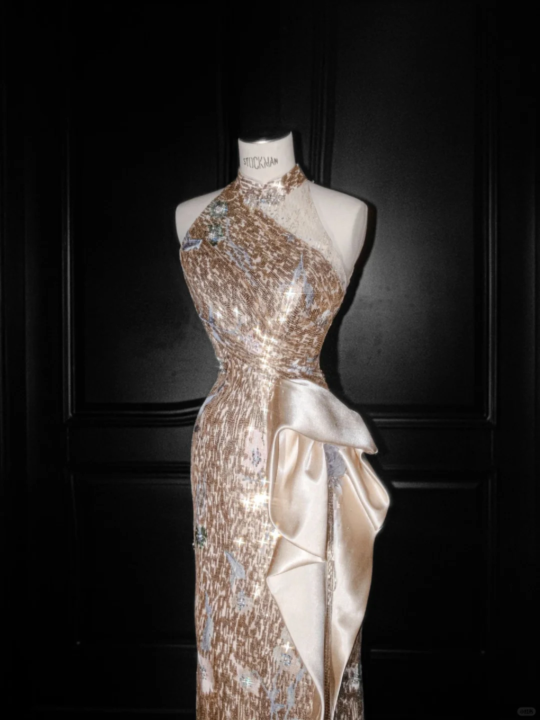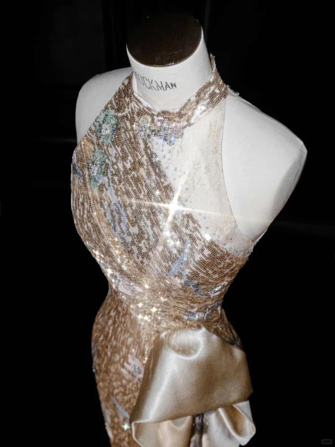 Glitter Champagne Gold Sequin Sheath Prom Dress Halter Long Evening Dress Y8653