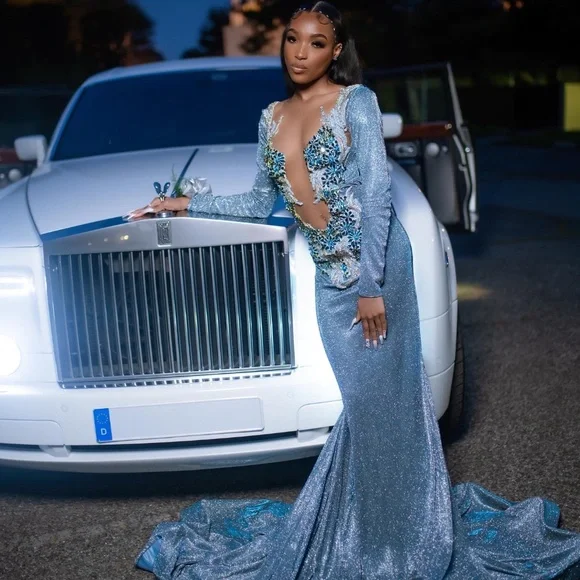 Gorgeous Blue Satin Beaded Appliques Formal Prom Dress Sexy Backless Mermaid Evening Dress Y7949